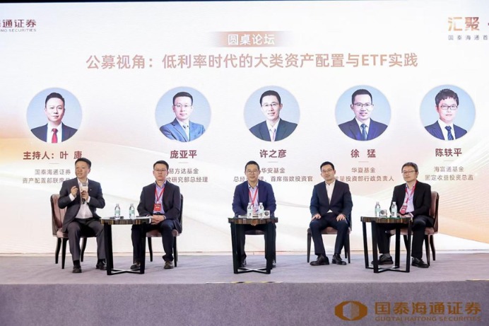 第二场公募圆桌论坛由国泰海通证券财富管理委员会委员、资产配置部联席总经理叶康主持,合计管理规模超过8500亿元的ETF基金经理同台论道:华安基金总经理助理、指数与量化投资部高级总监许之彦,华夏基金数量投资部行政负责人徐猛,易方达基金董事总经理、指数研究部总经理庞亚平,以及海富通基金固定收益投资总监陈轶平,共同探讨低利率时代的大类资产配置与ETF实践。今天参与圆桌讨论的嘉宾,分别管理着A股市场上规模领先的黄金ETF、港股ETF、宽基ETF以及债券ETF。嘉宾指出,在当前的市场环境下,大类资产配置的重要性日益凸显,而ETF正是落地各类配置方法论、提升投资获得感的高效工具。国泰海通面向各类客户提供专业客观的ETF配置服务:为互联网长尾及零售客户提供标准化组合,一键降低配置门槛;为企业与机构客户量身打造定制方案,精准匹配多元需求。