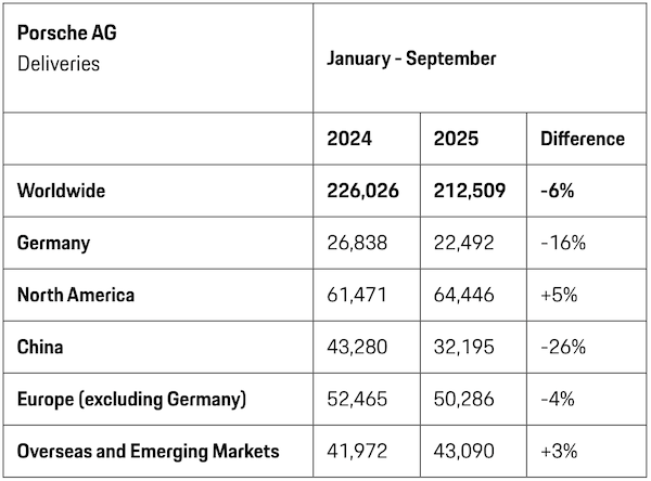 销量方面,今年前三季度,保时捷中国和欧洲市场出现了同比下滑,其中,中国市场销量下跌幅度最大,同比下滑26%至3.2万辆,德国市场销量同比下滑16%至2.25万辆,整个欧洲市场(除德国外)同比下跌4%至5万辆。这些主要市场的销量下滑,也让保时捷在今年前三季度销量整体下滑了6%至21.25万辆。