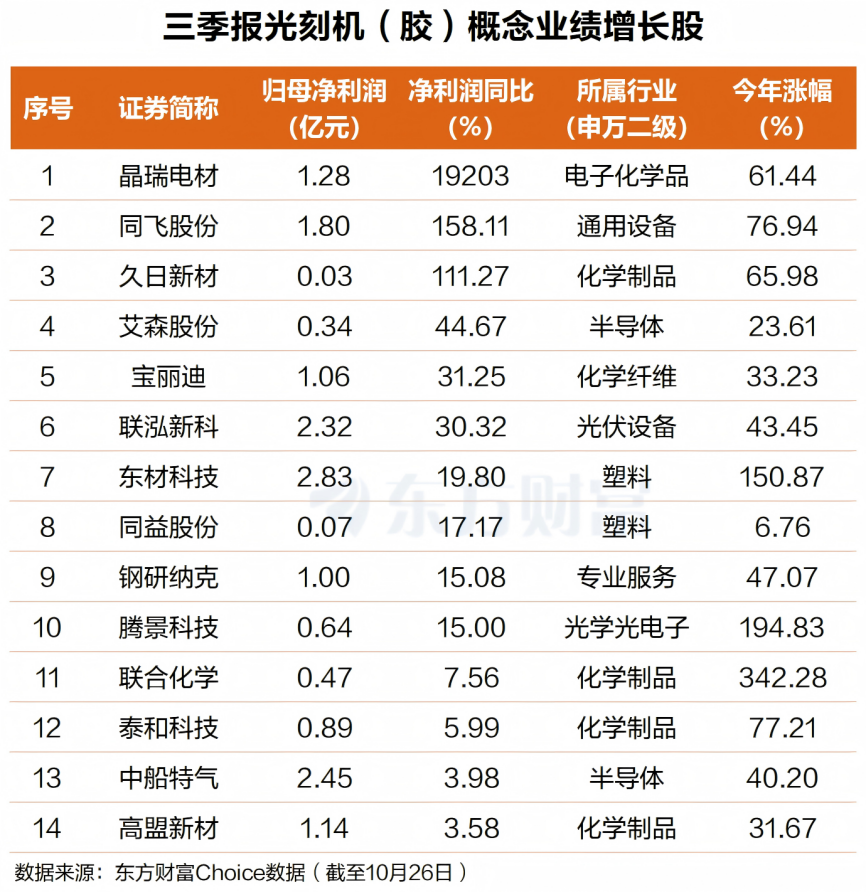 据东方财富Choice数据,截至10月26日,A股光刻机(胶)板块中已有二十余家公布了今年三季报,其中14家公司净利润同比增长。晶瑞电材净利润同比增幅最大,达192倍,同飞股份、久日新材净利润同比翻倍有余,艾森股份、宝丽迪等同比增超30%。