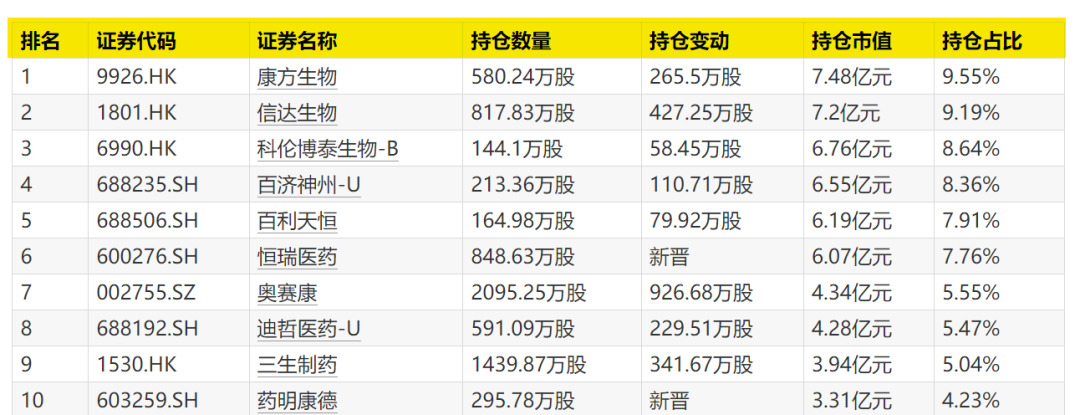 具体来看,从持仓市值来看,前两大重仓股康方生物、信达生物持仓市值最高,均超过7亿元。恒瑞医药和药明康德“新晋”前十大重仓股。其余,8只个股被不同程度增持,比如信达生物、百济神州-U较二季度末持仓翻倍。