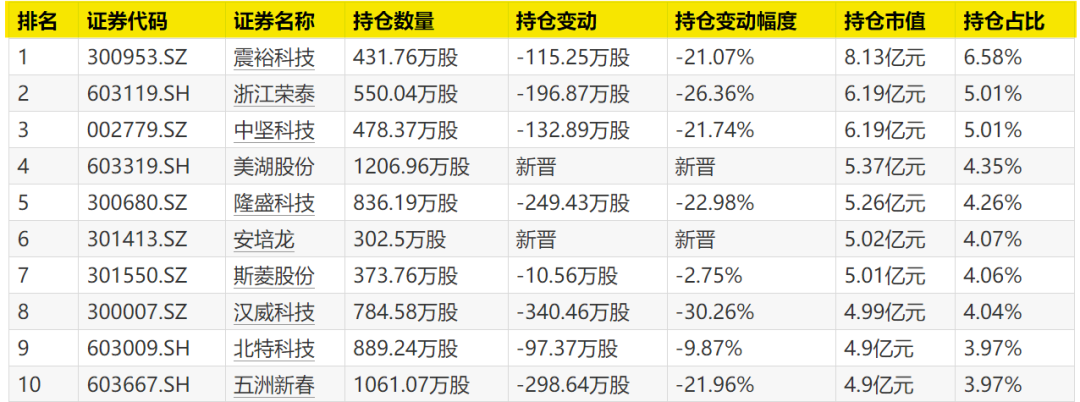 亿纬锂能、华友钴业、中芯国际、天孚通信、ST华通、兆易创新“新晋”前十大重仓股。