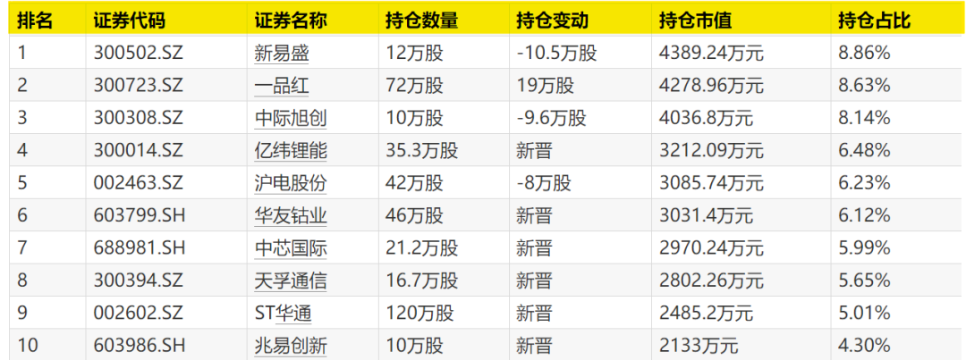 具体来看,根据三季报,前两大重仓股新易盛和一品红的持仓市值最高,分别超4200万元、4300万元。