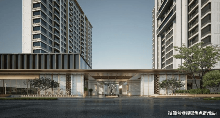 项目得建筑主体则采用 高级灰+香槟金铝板线条, 浅色臻石基座,融合以海派建筑元素,以经典三段式建筑,演绎东方式的低调奢华, L型折板+横向线条,将建筑的立面雕刻得更具层次与质感。