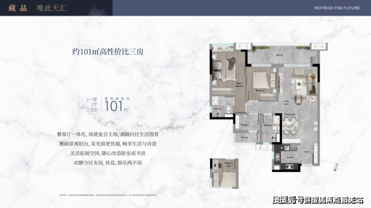 得房率85%(含赠送):入户花园6㎡可改造成茶室,主卧飘窗2.1米进深;