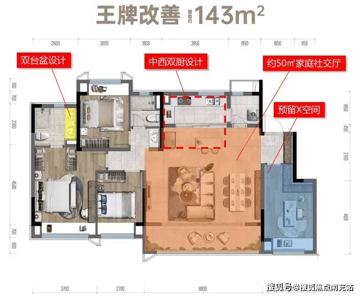 以建面约143㎡大四房方厅为例,一是注重家庭社交系统的高效性,融合客餐厅、厨房区、多功能区于一体,增加家庭成员间更加高效、亲密的交流空间
