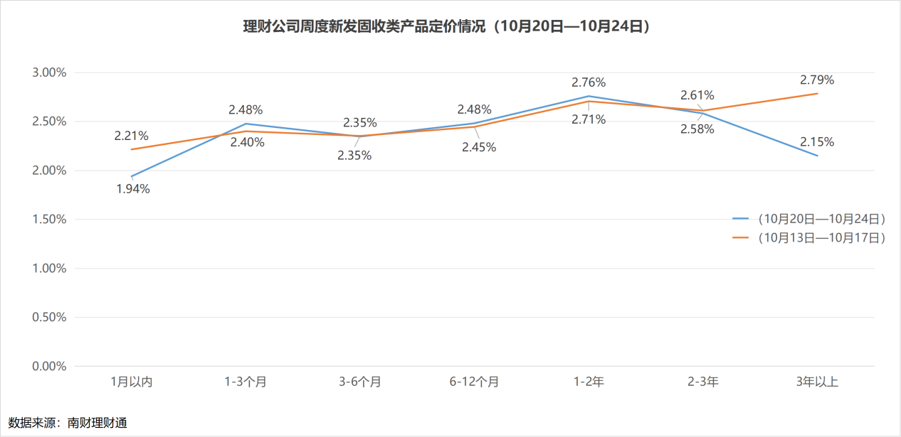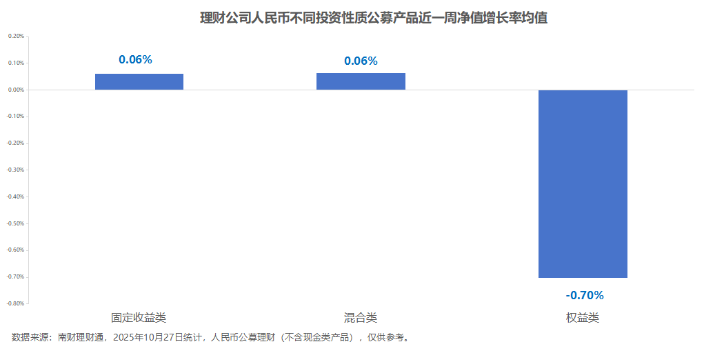 周度收益情况:整体上,截至10月27日,公募人民币理财产品近一周平均净值增长率为0.06%。其中,固定收益类、混合类理财近一周平均净值增长率均为0.06%,而权益类近一周平均净值增长率则告负,为-0.7%。