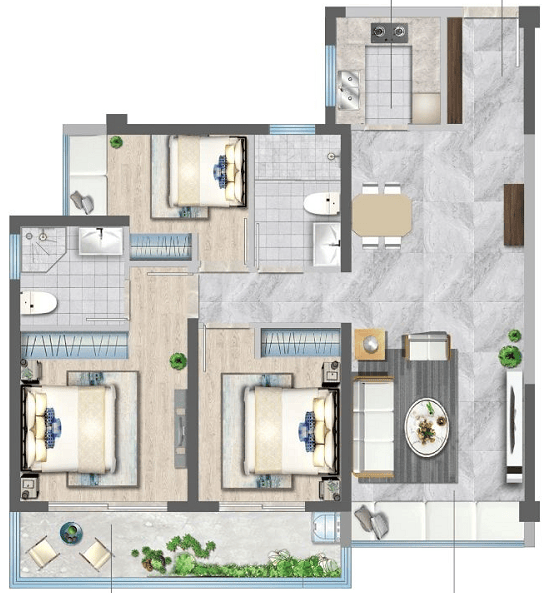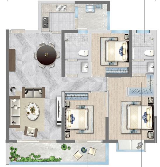 A1户型:建面约106㎡(三室两厅两卫)