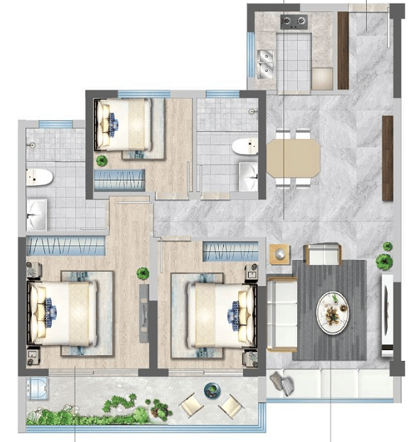 A3户型:建面约98㎡(三室两厅两卫)
