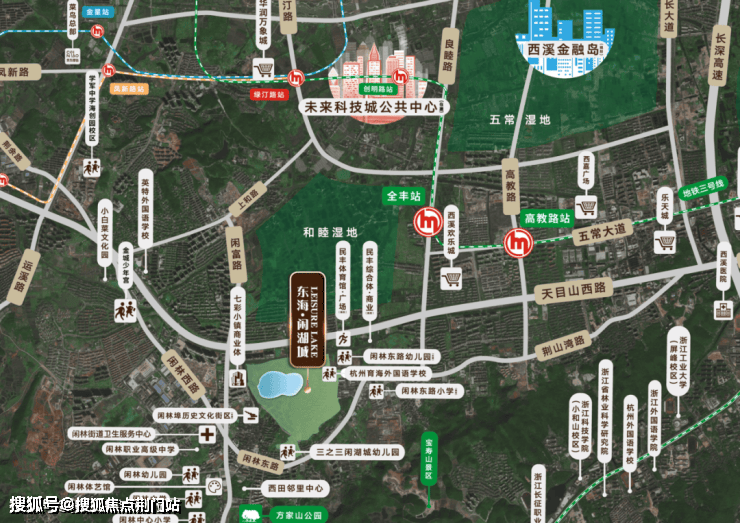 东海·闲湖城北面直线距离约3.5公里处,就是正在建设的绿汀路TOD,上盖的华润万象城正在热火朝天的建设当中;边上就是即将开建的未来科技城公共中心,共同组成了未来科技城的又一个引擎。此外,杭州西站已经通车,约399米的杭州第一高楼正在向天空生长;浙一医院一期已经开业,二期还将增加2000床位……