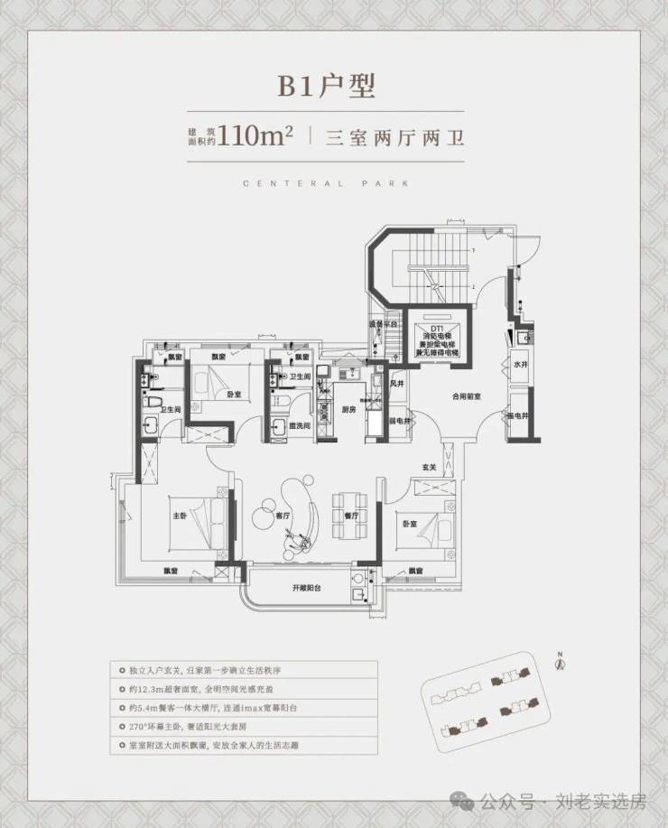 先来看建面约110㎡边套大横厅户型:约12.3米的超宽绰面宽几乎是堪比别墅产品 了,这个视野和 南向采光面相当出众。