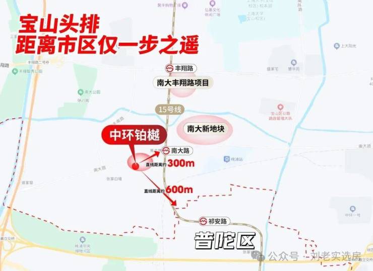 首先,中环铂樾是宝山头排,项目距离普陀直仅约600米,是整个南大乃至整个宝山距离市区最近的一个。
