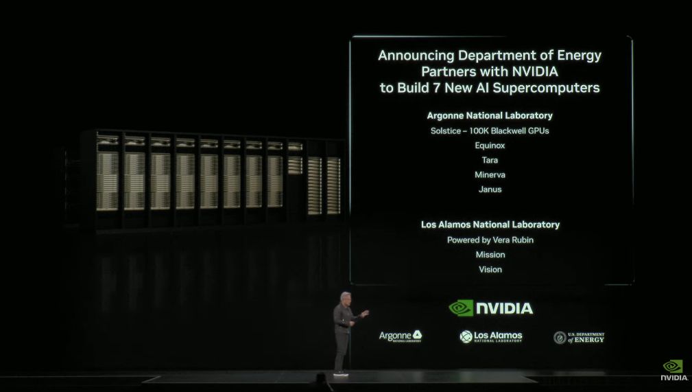 黄仁勋还宣布与美国能源部达成协议,将再建设7台超级计算机。这些超算将使用Blackwell和下一代Vera Rubin架构芯片,分别配置在阿贡国家实验室和洛斯阿拉莫斯国家实验室。