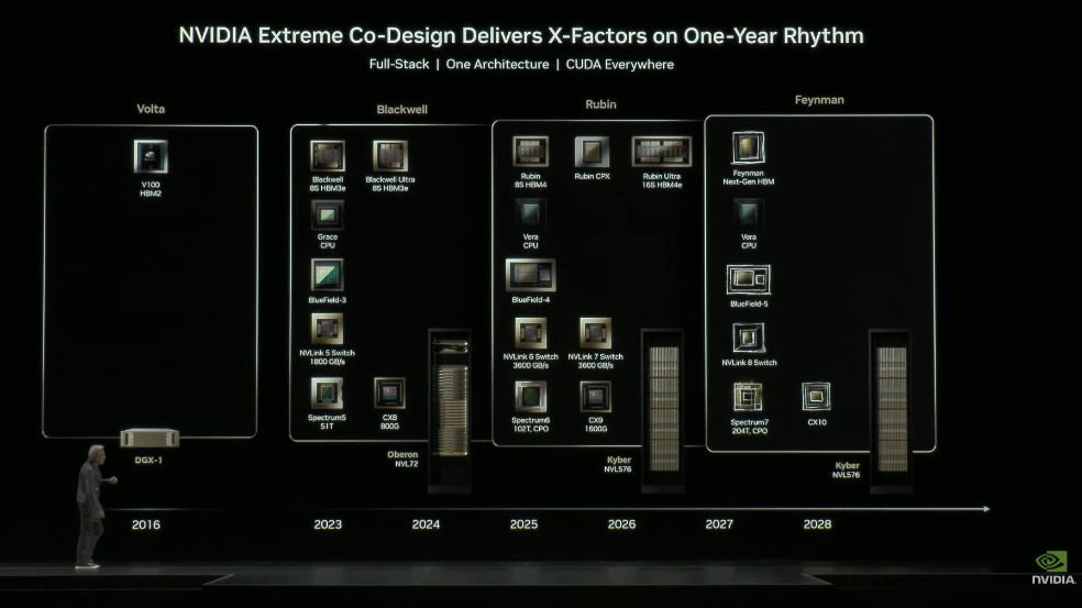 黄仁勋也在现场展示了英伟达截至2028年的GPU路线图,和下一代Vera Rubin架构芯片的样机。这款产品可能要到明年此时或更晚一些才能量产发货。