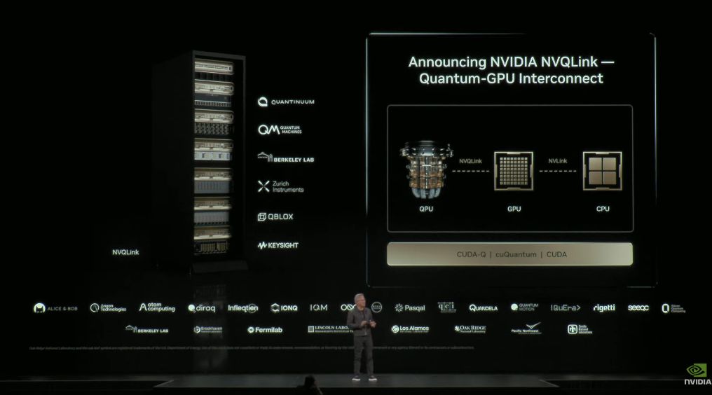 英伟达同时展示了基于CUDA-Q核心构建的NVQLink,用于连接传统GPU和量子计算机,共同加速量子计算。目前的量子计算对环境噪声高度敏感,且可用性有限。因此需要基于GPU的超级计算机承担起量子处理器的部分负载,支持量子纠错所需的控制算法。