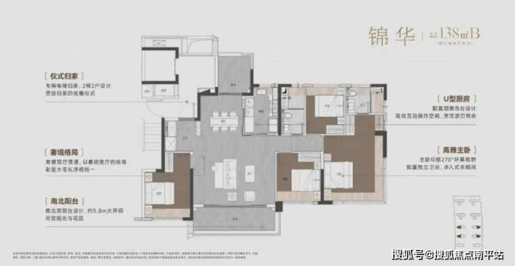 小高层138㎡户型采用专梯专户设计,每户自带约9㎡私家电梯厅,相当于多了一处“入户玄关”。南北对流双阳台+主人房270°飘窗,采光和视野直接拉满。高层138㎡户型则直望社区花园,餐客厅无.界联通,U型厨房可开可合,适合家庭互动。