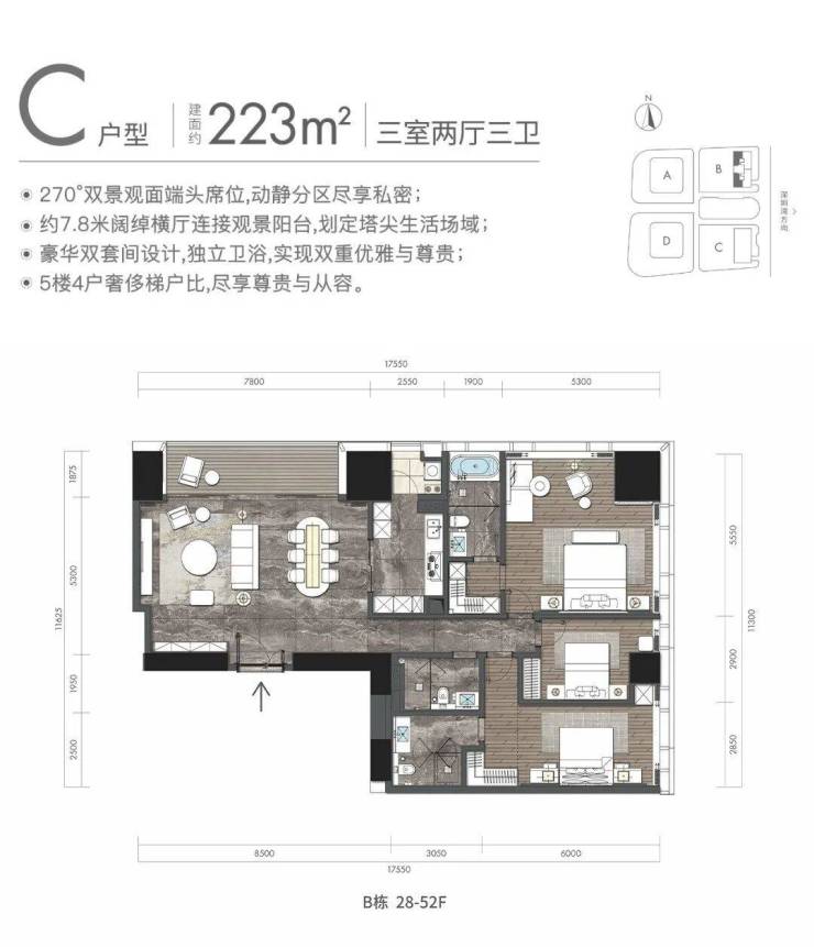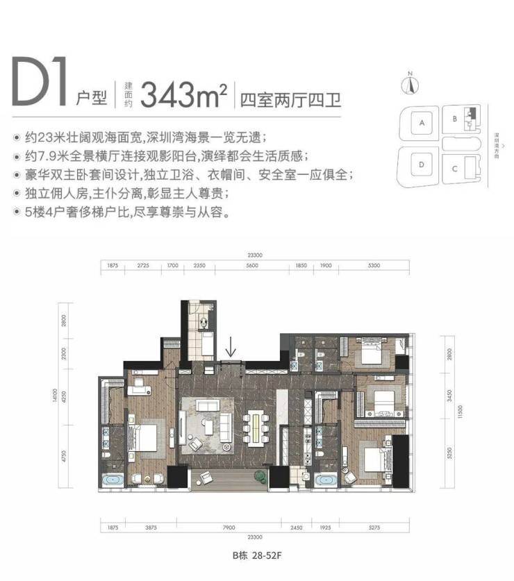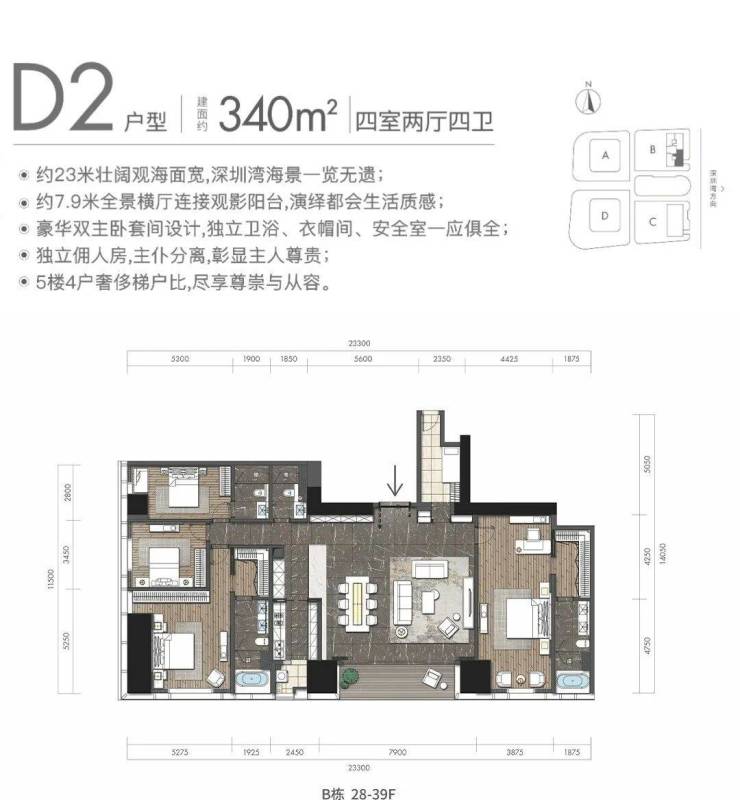 项目主打约340-580㎡的4-5房环幕海景公寓,配备约2.45米宽幅玻璃,完美呈现深圳湾绝美景观。全屋采用一线国际精装品牌定制,打造塔尖生活典范。
