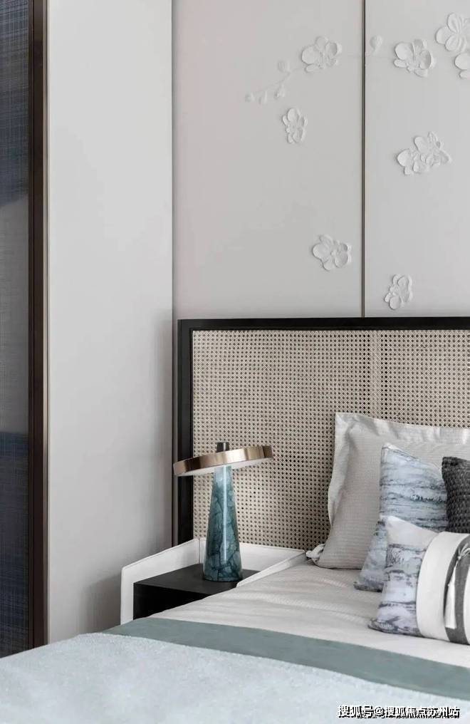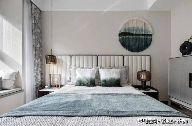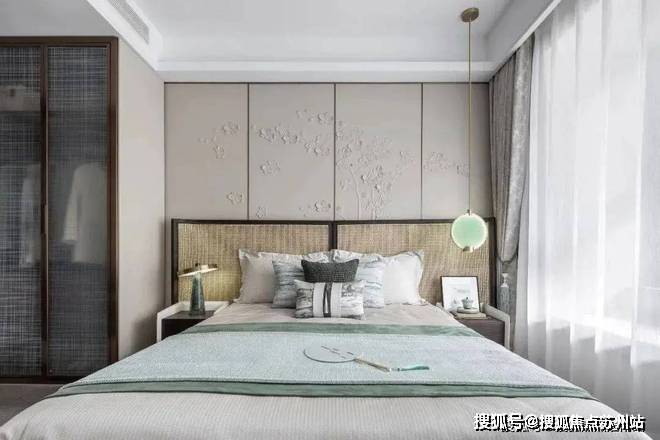 藤编式的大床,还有青色的灯具,都让整个主卧更有一派儒雅之美。