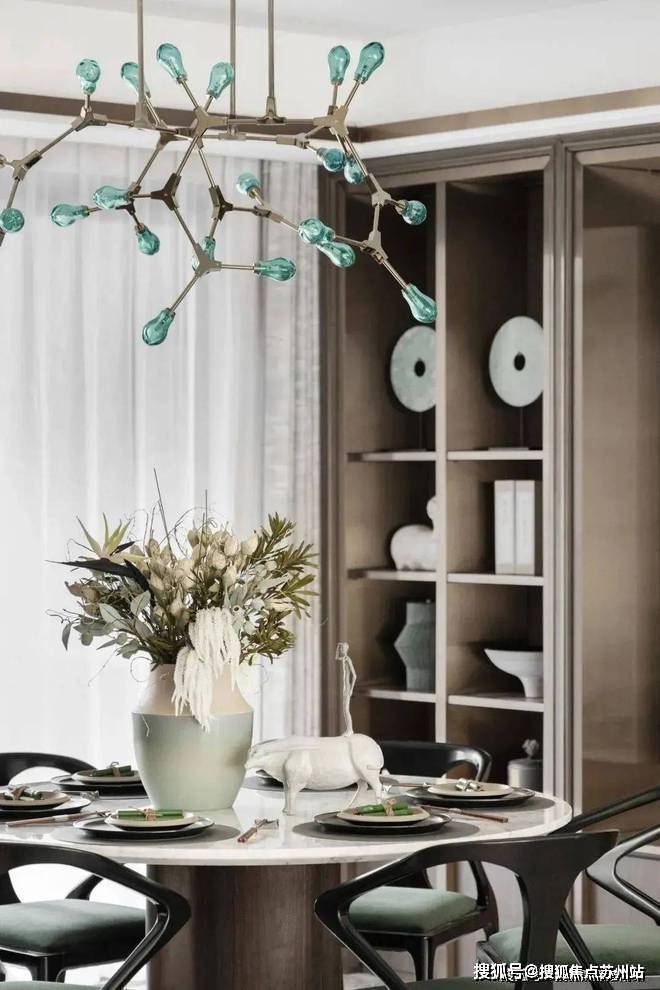 餐厅在整体设计上,沿袭了客厅的配色和风格,简约却又不失格调,尤其是山水墨画元素的融入,让用餐氛围更显温馨感。