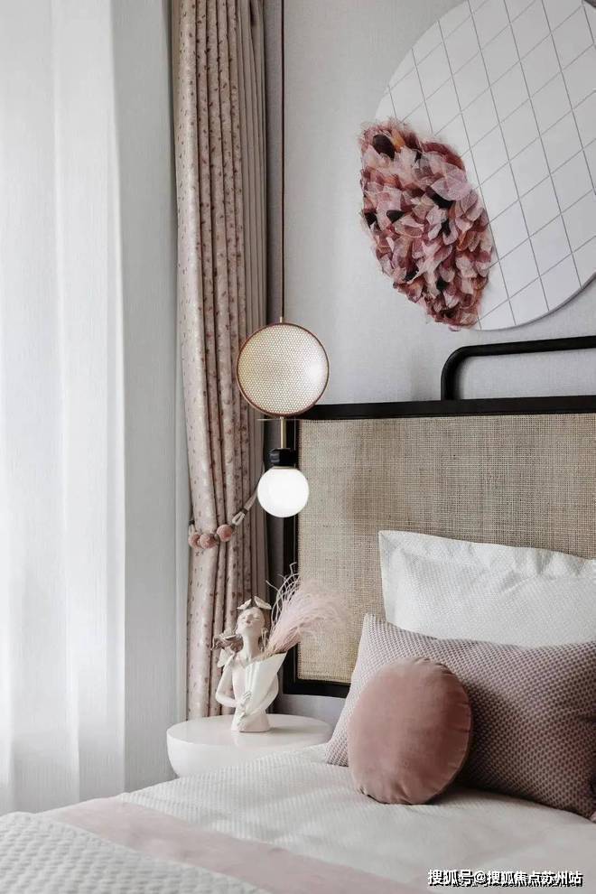 女儿房的空间设计,沿袭了主卧的藤编式大床,同时融合了粉色之调,更有属于少女的浪漫之感。
