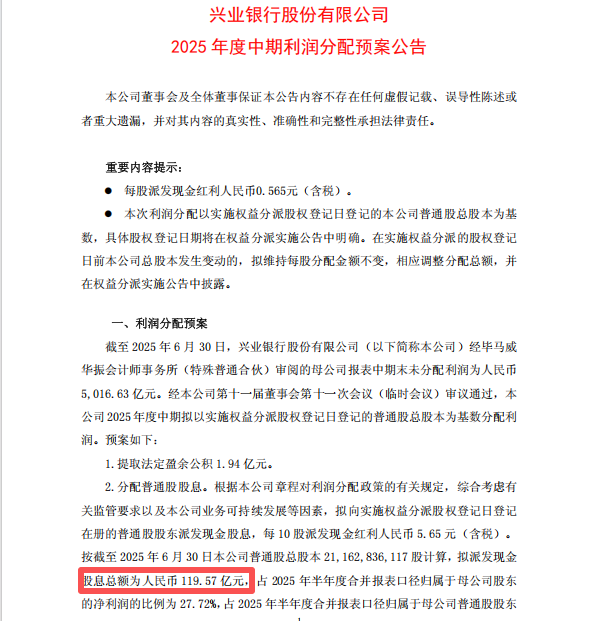 以兴业银行为例,其10月31日发布的2025年度中期利润分配预案显示,拟向全体股东每股派发现金红利0.565元(含税),拟合计派发现金红利119.57亿元(含税)。