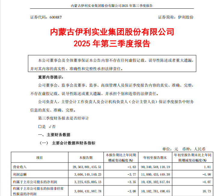 伊利股份主要从事各类乳品及健康饮品的生产与销售,2025年前三季度的归母净利润同比下降4.07%至104.26亿元,扣非后净利润同比增长18.73%至101.03亿元。