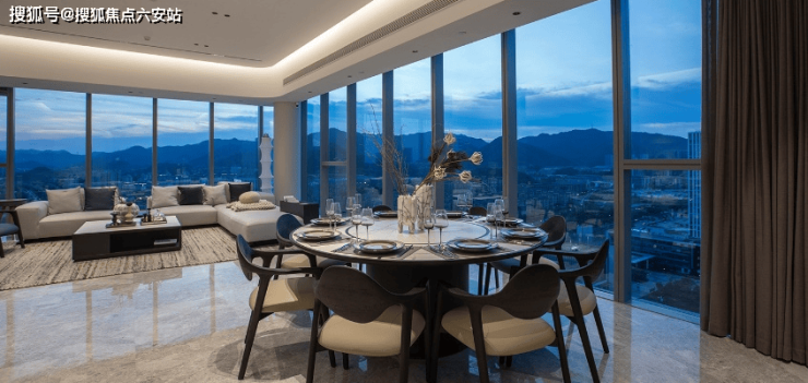 幕墙结构配以极窄边框设计,物理存在感被弱化至最低,真正实现“框景为画”的视觉效果。无论晨光微熹、云海翻腾,抑或夕阳鎏金、星河璀璨,居住者皆可在室内自由空间中尽揽天地壮美。这种无遮挡、无边界的视觉体验,重新定义了“景观房”的标准。