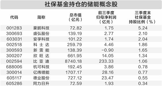 截至三季度末,11只储能概念股获得社保基金持仓,豪鹏科技、盛弘股份、安孚科技、科士达等持股比例居前。