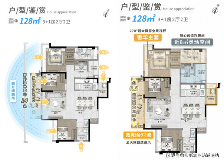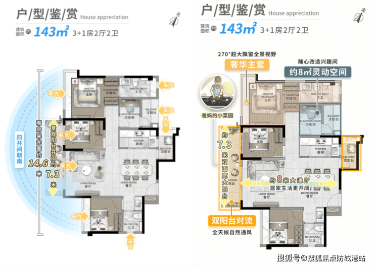 143㎡四房两卫:南北双阳台设计,四面朝南,实用面积达121㎡。