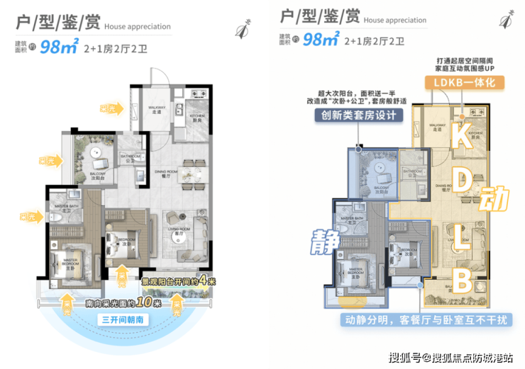 98㎡三房两卫:竖厅设计,主卧带270°转角飘窗,三开间南向采光;
