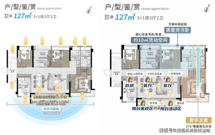 127㎡四房两卫:横厅布局,约13.2米超长南向采光面,双面景观阳台;