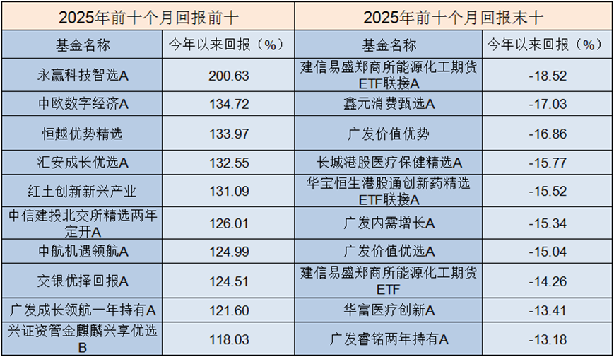 基金方面,据Wind数据统计,2025年前10个月,全市场13344只主代码基金平均回报17.98%,其中翻倍基35只,占比0.26%,且全部均为主动管理型偏股类基金,包括偏股混合型基金25只,8只灵活配置型基金,只有易方达战略新兴产业为普通股票型基金,只有汇添富香港优势精选为QDII基金。