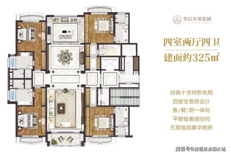 相信鲁信有邻花园这款建面约325平户型,即便是放在上海都是顶格的存在!3.4米豪华层高、四叶草套房设计、LDKB方正公厅、造价超70万豪装厨房、进口顶级橱柜/家电…..