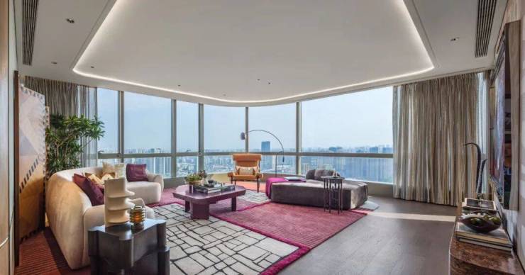 位于建筑东南角的端户设计,从次卧延伸至客厅、主卧形成270度无立柱观景厅。超宽幅落地窗同时收纳城市天际线与自然江景,客厅远眺攀成钢片区,主卧直面锦江与望江公园景观。