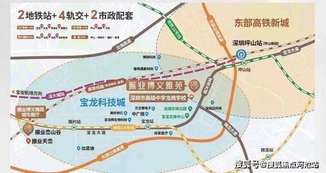 振业博文雅苑位于龙岗区宝龙街道宝龙大道与锦龙一路交汇处,项目紧挨着深圳高级中学龙岗学校,北侧是金众蓝钻。周边有占地25万㎡的龙湖公园,龙岗骨科医院,14号地铁线“宝龙站”距离约1.9公里,还有东部过境高速即将开通。