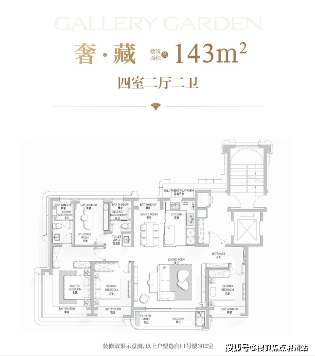 143㎡洋房四房:南向四开间面宽约15.5米,主卧270°飘窗,“类一梯一户”设计