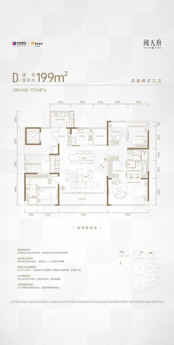 199㎡(端厅四室两厅双卫/南厅四室两厅三卫);均价3.3-4万/㎡;总价670-800万