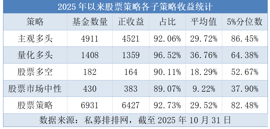 值得注意的是,股票策略中,量化多头策略以36.76%的平均收益率和96.52%的正收益占比成为绝对赢家,其收益率不仅显著高于股票策略整体水平,更超出主观多头策略7.04个百分点。