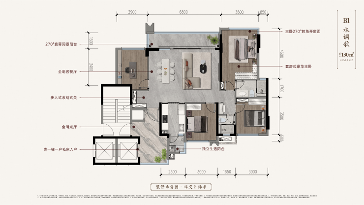 项目共有5个户型,包括128、130、143、188、191㎡。所有户型都是光厅入户、大面宽,且得房率高达91-94%。项目本批次推出的是130和143㎡户型。