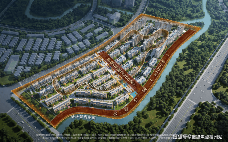 整个地块三面都被绿地与河道包裹,尤其是项目东侧,公共绿地、滨河景观带、城市生态走廊此地排列,天然具备 构建多层次景观视域的条件。