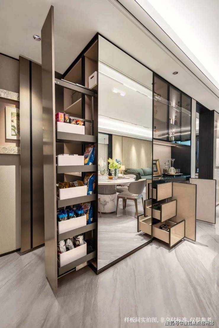 125㎡户型仅仅在客厅公区,就打造了三处 整面墙的柜子来做收纳,除了传统的收纳柜,还有隐藏推拉零食架、内嵌式吧台等创新收纳方案,从衣服鞋帽,到大件行李箱再到家用清洁工具,都有专属的安置空间。