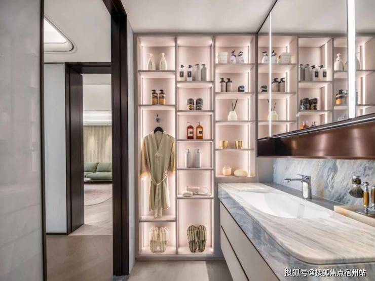 主卫镜柜收纳空间,满满的一面墙,还贴心配置了一个可调节温度的美妆冰箱 ,女主人看到了很难不心动!