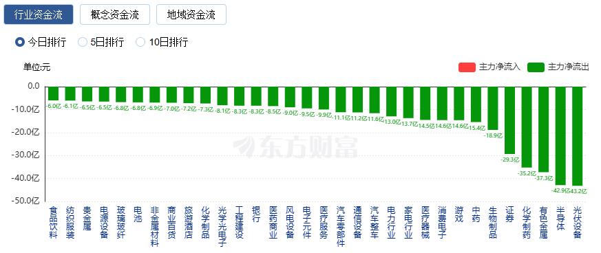净流出方面,光伏设备、半导体、有色金属等净流出排名靠前,其中光伏设备净流出43.169亿元。