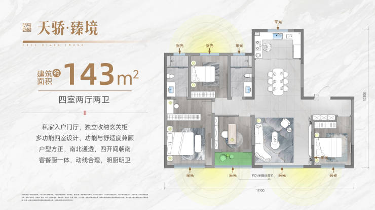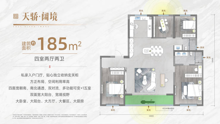 两轴五进一环多景,主入口清流浅溪、名贵造型松三株迎客,吉祥如意