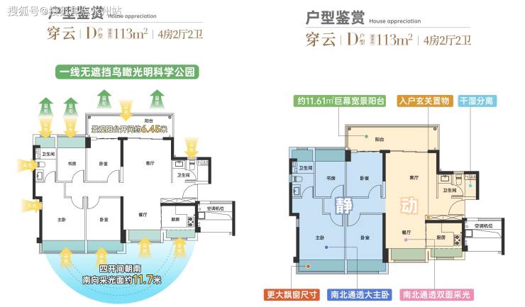 建面约113㎡的4房,用大开间+短进深的经典格局,实现南北通透。