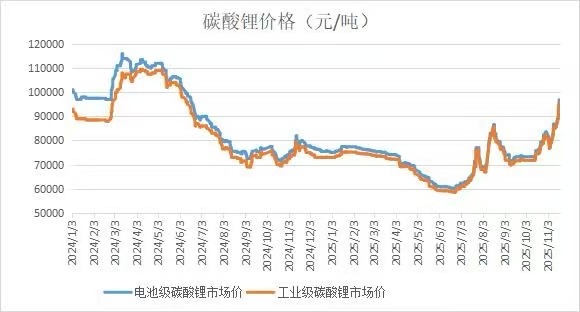 截至11月19日收盘,主力LC2601合约上涨4.97%至9.93万元/吨,LC2604等远月合约涨幅则全线涨破10万元/吨,续创年内新高。