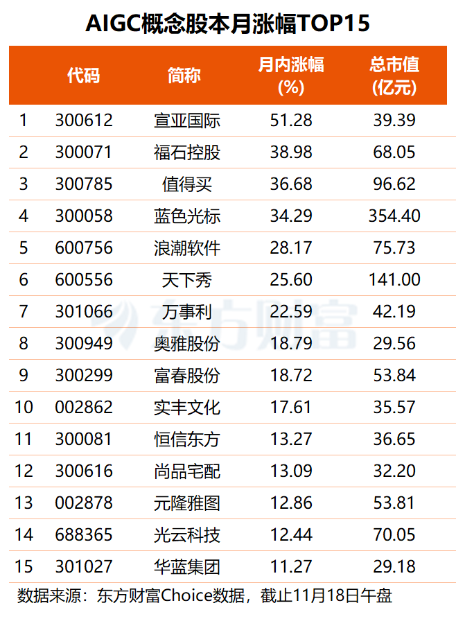 本月以来,多只概念股股价显著上涨,宣亚国际福石控股值得买位居前三,月内涨幅分别为51.28%、38.98%和36.68%。