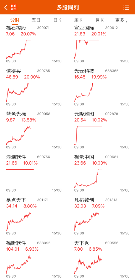 AI应用方向早盘延续强势,其中AIGC概念股集体大涨,宣亚国际收获20cm两连板,福石控股值得买光云科技均20cm涨停,视觉中国元隆雅图浪潮软件亦封板,蓝色光标涨超13%,易点天下福昕软件天下秀等多股跟涨。