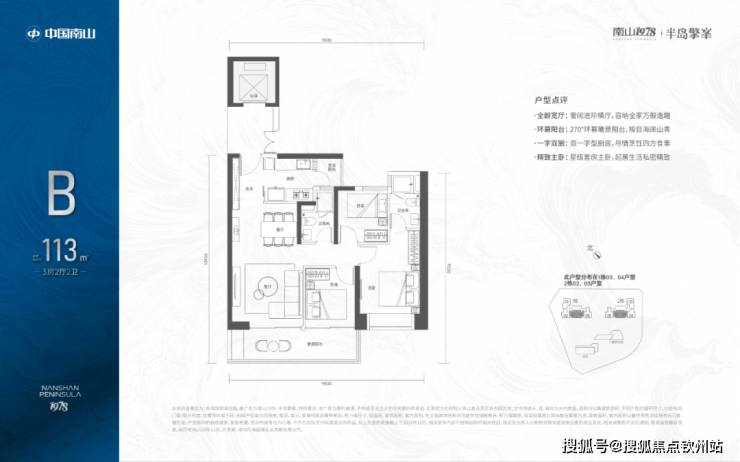 113㎡的3房2厅2卫,设计的是竖厅格局,电梯入户送独立公区,LDKB一体化设计,动静分区,三开间朝南,客厅连接次卧出超大观景阳台,主卧大套间设计,二字型厨房带1个小生活阳台,卫生间干湿分离,得房率:72.07%(不含赠送),西南朝向。
