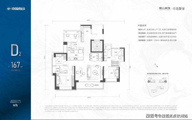167㎡的5房2厅3卫,1栋02/2栋03高区户型,电梯入户送独立公区,设计的是竖厅双龙抱珠格局,四开间朝南,超宽敞客厅巨幕阳台,主卧大套间设计,U型厨房,双公卫三段式分离,得房率:72.07%(不含赠送),西南朝向。