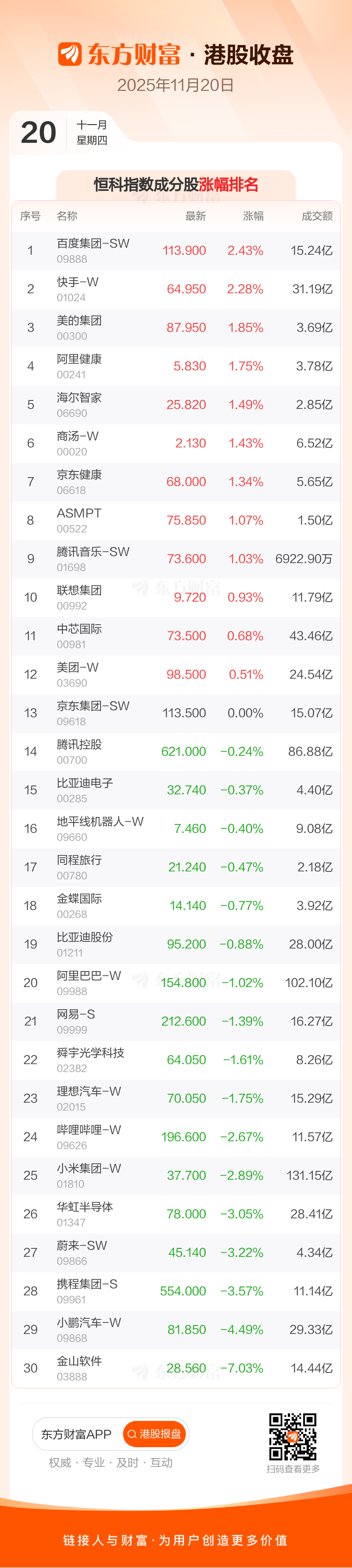 11月20日港股收盘:恒指涨0.02% 科技指数跌0.58%